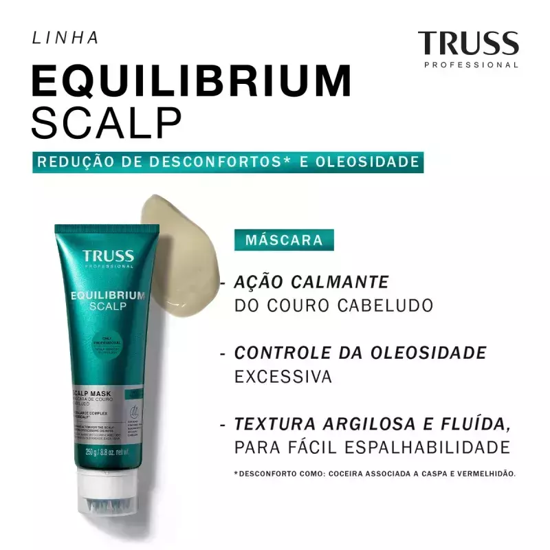 Equilibrium Scalp é a linha de TRUSS que promove ação antioleosidade, anticaspa e anti irritação* . Com a tecnologia Scalp Reboost, Equilibrium Scalp traz efeito de longa duração com ação calmante e revitalizante do couro, eliminando 100% da caspa visível com fragrância fresca que promove sensação de bem estar.